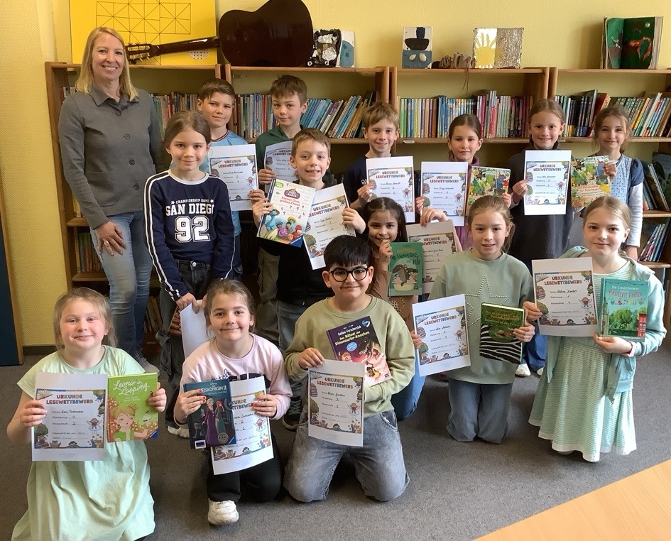 Diese drei stolzen Kinder sind die jeweiligen besten Vorleser*innen der Jahrgänge 2, 3 und 4!